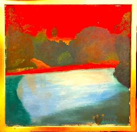 " Morgon vid vatten " Olja på duk av Lennart Hall. Egenhändigt betitlad och med svag signatur på etikett a tergo. 70x100 cm. Prov. Släkten Nordqvist, Stenänga, därefter i arv. Liten lagning och dukskada.