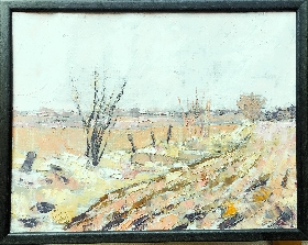 " Utsikt Svedala-Nygård 1949 " Olja på pannå av Emil Johanson-Thor. Sign. 54x65 cm. Betitlad och daterad a tergo.