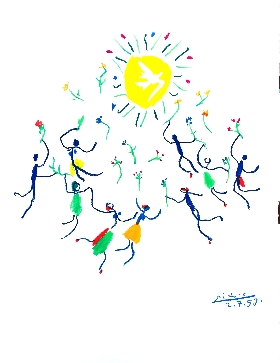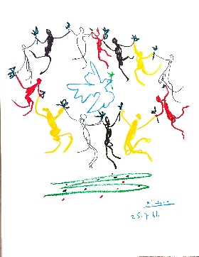 " La Ronde de la Jeunesse " Färglito efter Pablo Picasso. Sign i trycket 2.7. 59.- Tryckt på arches. Upplaga okänt antal. Pappersformat 65x50 cm. Prov. . Sture Andersson, Arne Sundberg, Kaptengården. Borstahusen. Ej ram. Liten kantfläck