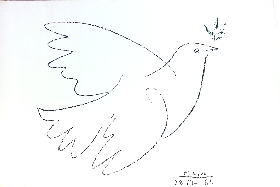 " The Dove of Piece " Färglito efter Pablo Picasso. Sign. i trycket. 28.12.61. Tryckt på arches. Pappersformat 39x58 cm. Upplaga okänt antal. Prov. Sture Andersson, Arne Sundberg. Kaptensgården Borstahusen. Ej ram. Hörnveck.