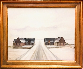 " Vägen, Bosjökloster. " Olja på pannå av Emil Johanson-Thor. Sign. 1935. 57x72 cm. Utställd Carnegie Institute Pittsburgh USA. Svensk Franska konstgalleriet Stockholm 1936 samt Sundsvalls Konstförening 1936 nr 1.