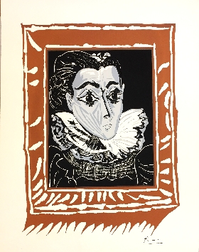 " La Dame a la Collerette " Färglito after Pablo Picasso. Sannolikt litograferad av Henri Deschamps. Sign. i trycket. 53x39 cm. Tryckt på arches, Prov. Sture Andersson och Arne Sundberg, Kaptensgården. Borstahusen. Ej ram.