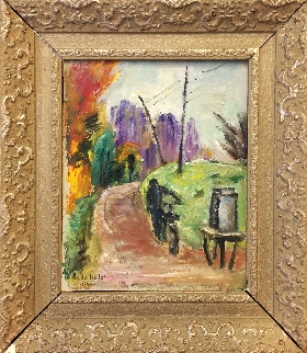 " Vägen, Bosjökloster. " Olja på pannå av Emil Johanson-Thor. Sign. 1935. 57x72 cm. Utställd Carnegie Institute Pittsburgh USA. Svensk Franska konstgalleriet Stockholm 1936 samt Sundsvalls Konstförening 1936 nr 1.