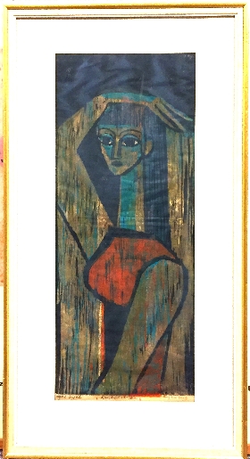 " Krukbärerska " Färgträsnitt av Maj Hemberg. Sign, eget tryck. 60x24 cm.