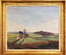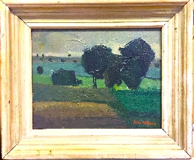 " Utsikt Svedala-Nygård 1949 " Olja på pannå av Emil Johanson-Thor. Sign. 54x65 cm. Betitlad och daterad a tergo.